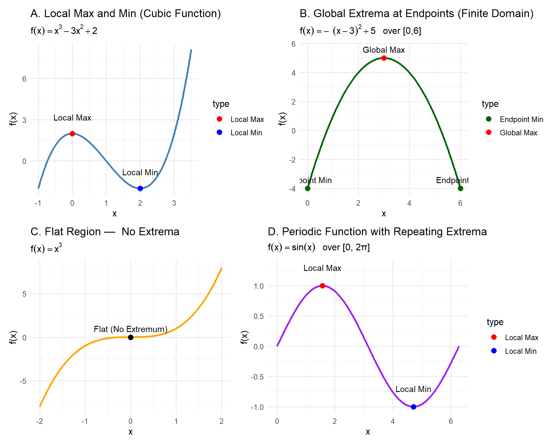 | D | \(f(x) = \sin(x)\) | Repeating local maxima/minima in periodic behavior |