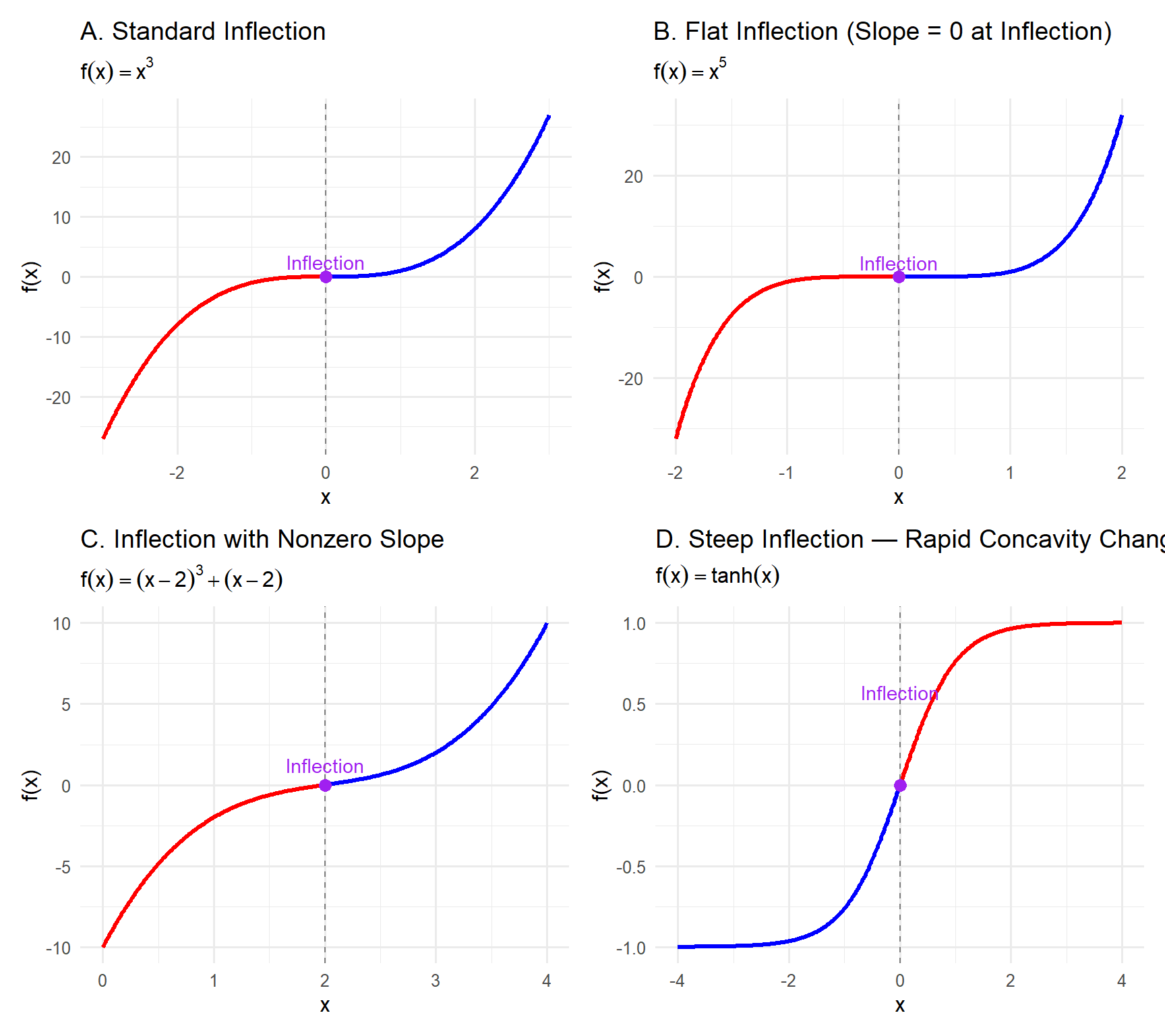 Interpretation: Curvature flips at 0 (classic S-shape); marks a transition from decelerating to accelerating growth.