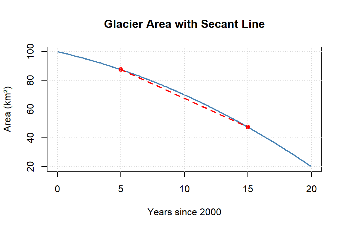 In this section, you’ll shift from practicing the mechanics of the limit definition to exploring how derivatives help us understand real environmental systems. The goal here is not to calculate every derivative by hand, but to think about what the rate of change means in context—whether it’s the growth of a fish population, the retreat of a glacier, or the decline of dissolved oxygen in a lake. You’ll connect mathematical concepts like slopes and instantaneous change to real-world data, scenarios, and management questions. By the end, you should be able to explain in your own words how derivatives provide insight into environmental patterns and processes, and why they are a powerful tool for interpreting change.