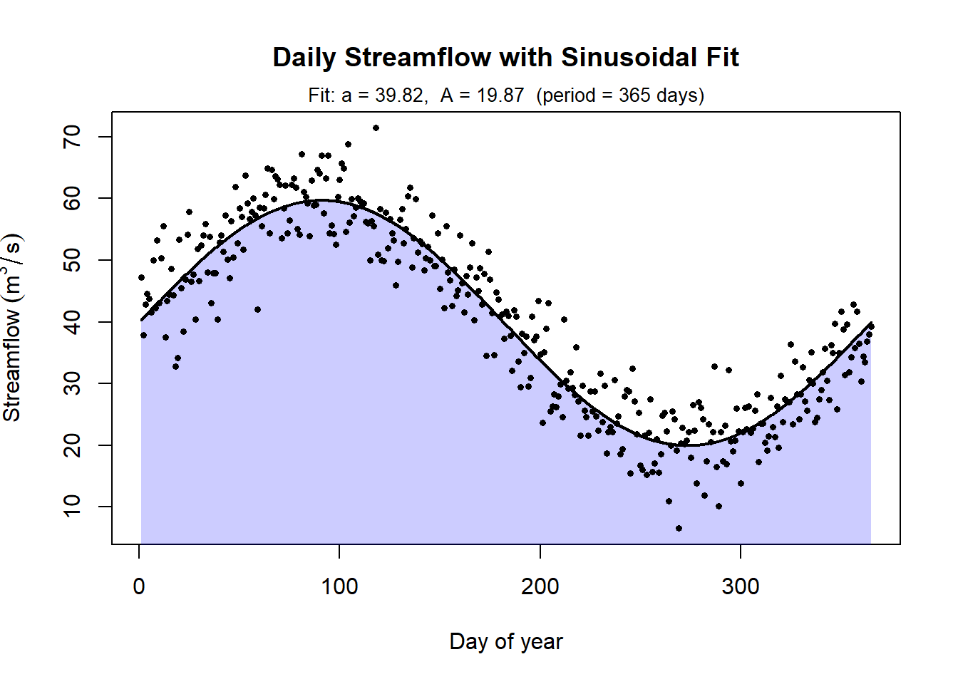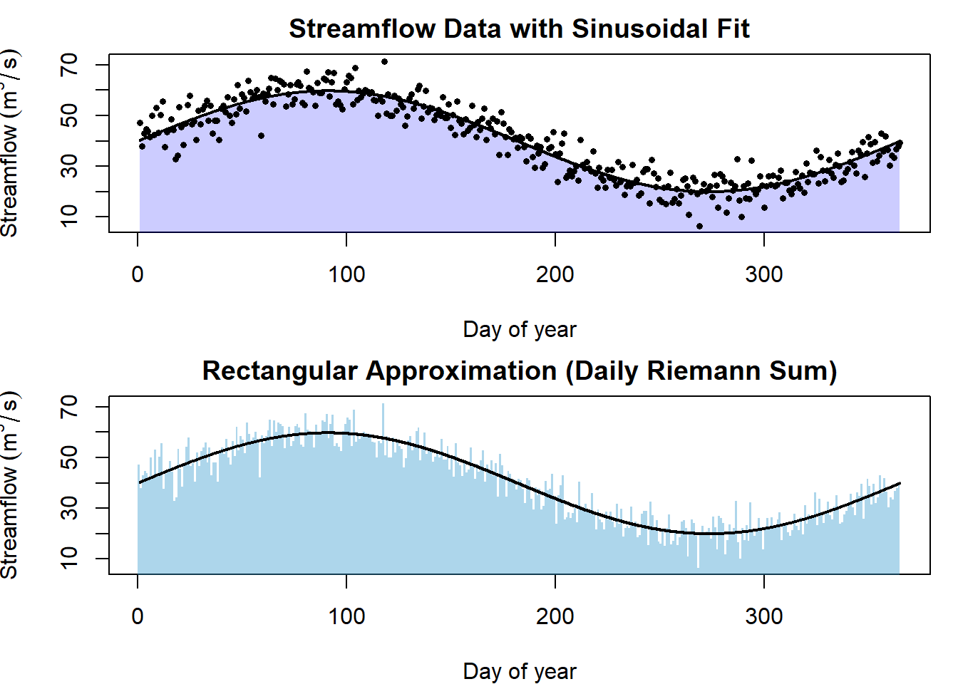 We first fit a smooth, sinusoidal model to the daily streamflow data and then integrated that function over time.Numerical integration of the data directly