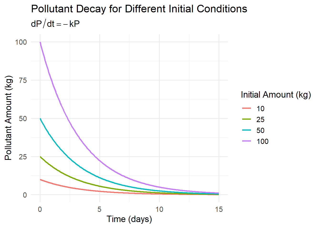 Imagine a lake with pollutant concentration \(P(t)\) measured in kilograms.