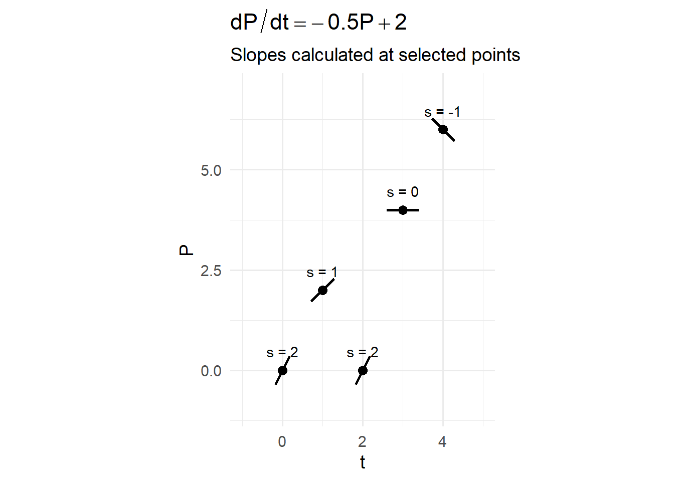 - \(P=4:\;\; dP/dt=-2+2=0\) (flat / equilibrium)
