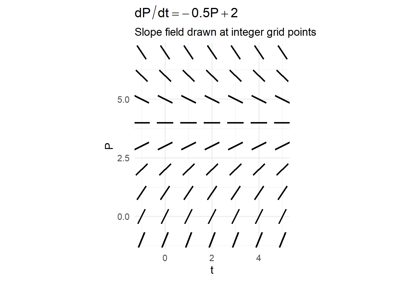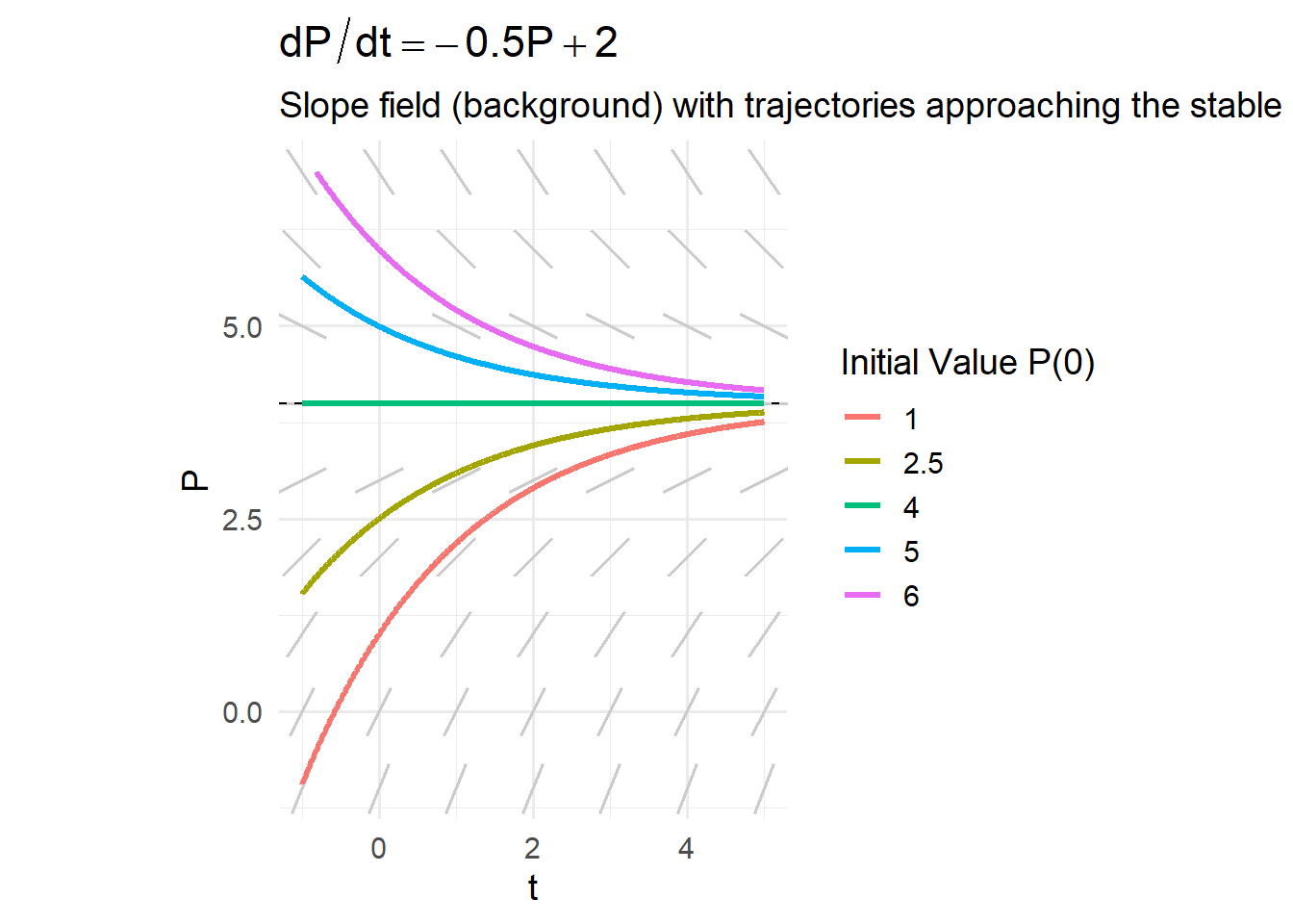 - Equilibrium and stability for \(\dfrac{dP}{dt}=-0.5P+2\).