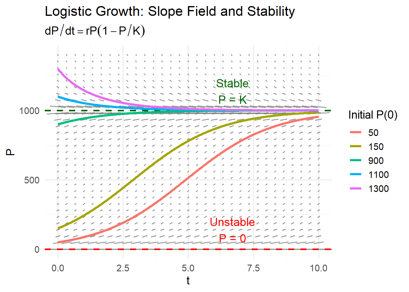 Equilibria from \[ rP\left(1-\frac{P}{K}\right)=0 \Rightarrow P=0 \text{ or } P=K. \] If \(0<P<K\), then \(dP/dt>0\) so solutions move upward away from 0 → \(P=0\) unstable.
