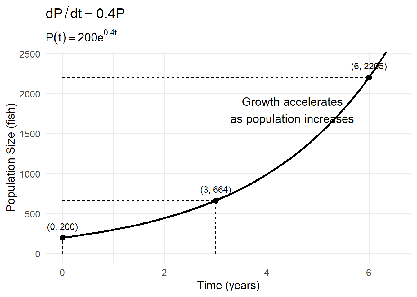 Suppose \(r=0.6\ \text{yr}^{-1}\) and \(K=10000\) fish.