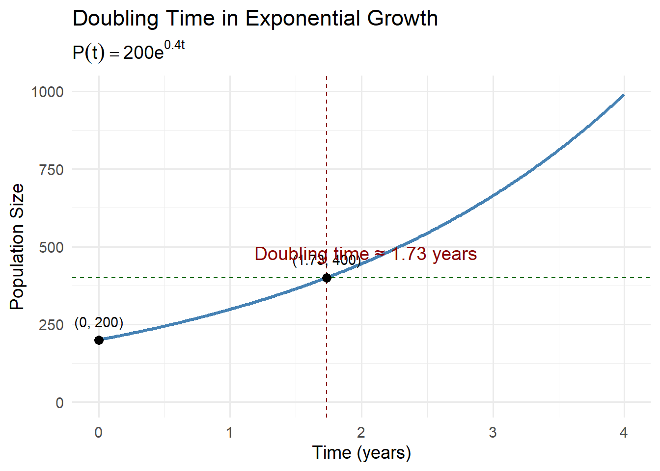 \[ t_d=\frac{\ln 2}{r}=\frac{0.693}{0.4}\approx 1.73\ \text{years}. \] It does not depend on \(P_0\) because \(P_0\) cancels when you set \(2P_0=P_0e^{rt}\).