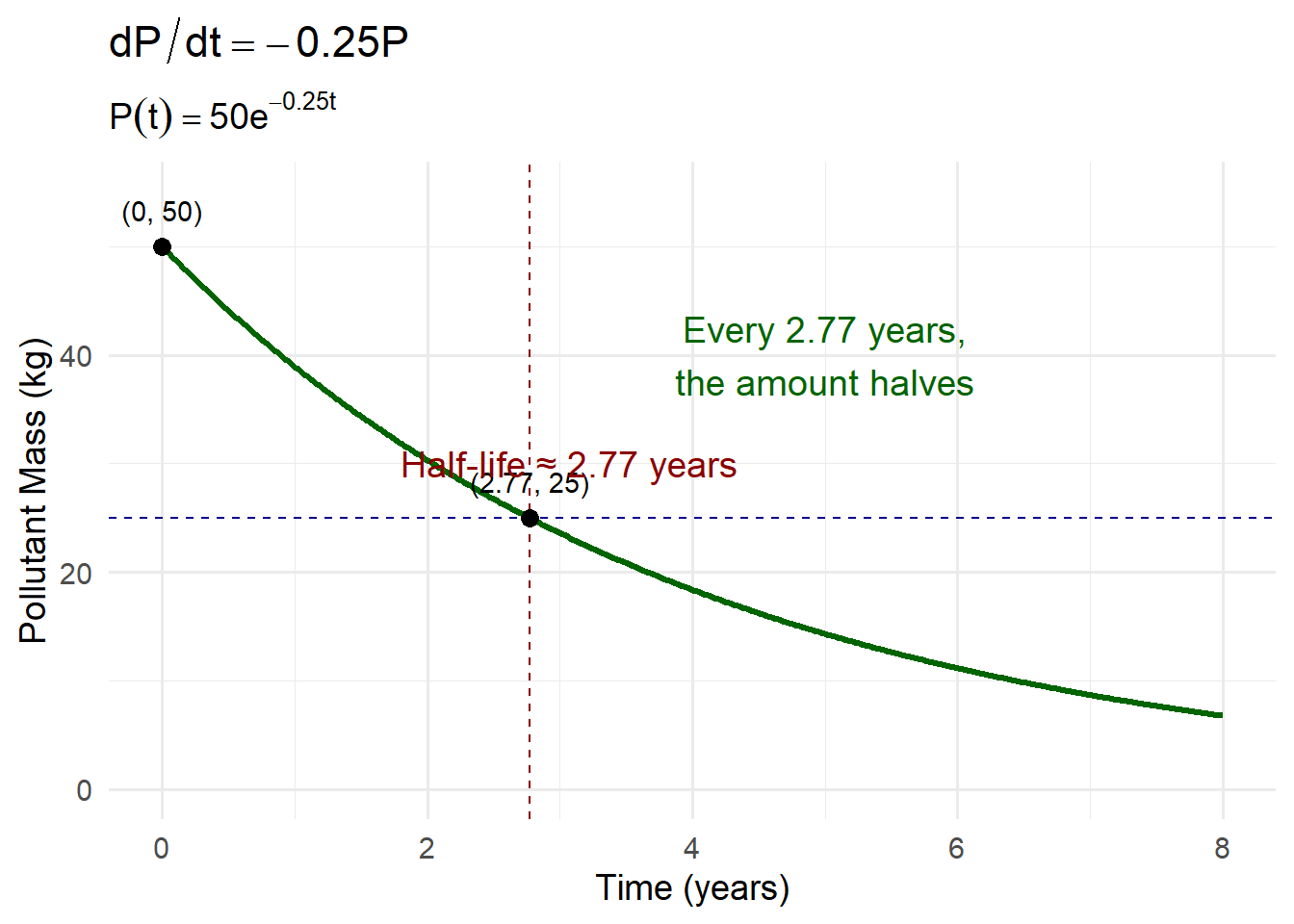 \[ t_{1/2}=\frac{\ln 2}{k}=\frac{0.693}{0.25}\approx 2.77\ \text{years}. \] “Half-life is constant” means the time to halve is the same no matter the starting amount, because proportional decay depends on fractions, not absolute amounts.