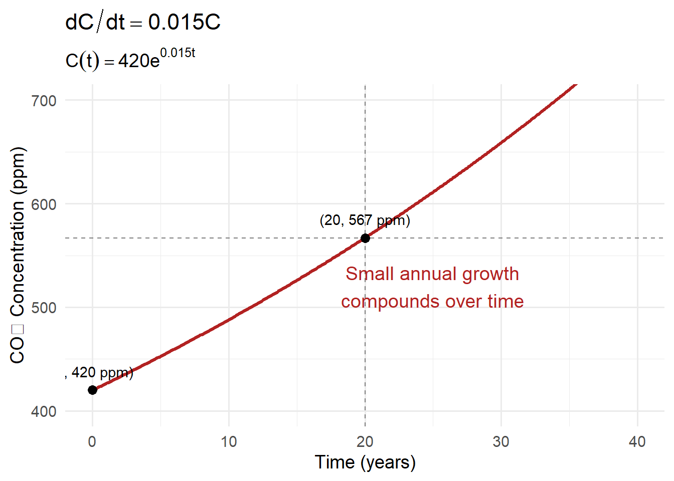 \[ C(t)=420e^{0.015t}. \] \[ C(20)=420e^{0.3}\approx 420(1.350)=567\ \text{ppm (approx)}. \] A small percent growth compounds because each year’s increase builds on a larger base, so long-term change can become large even when the annual rate looks modest.