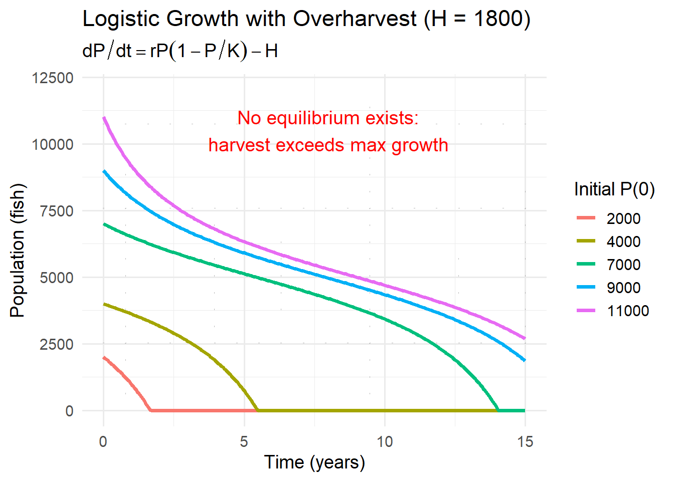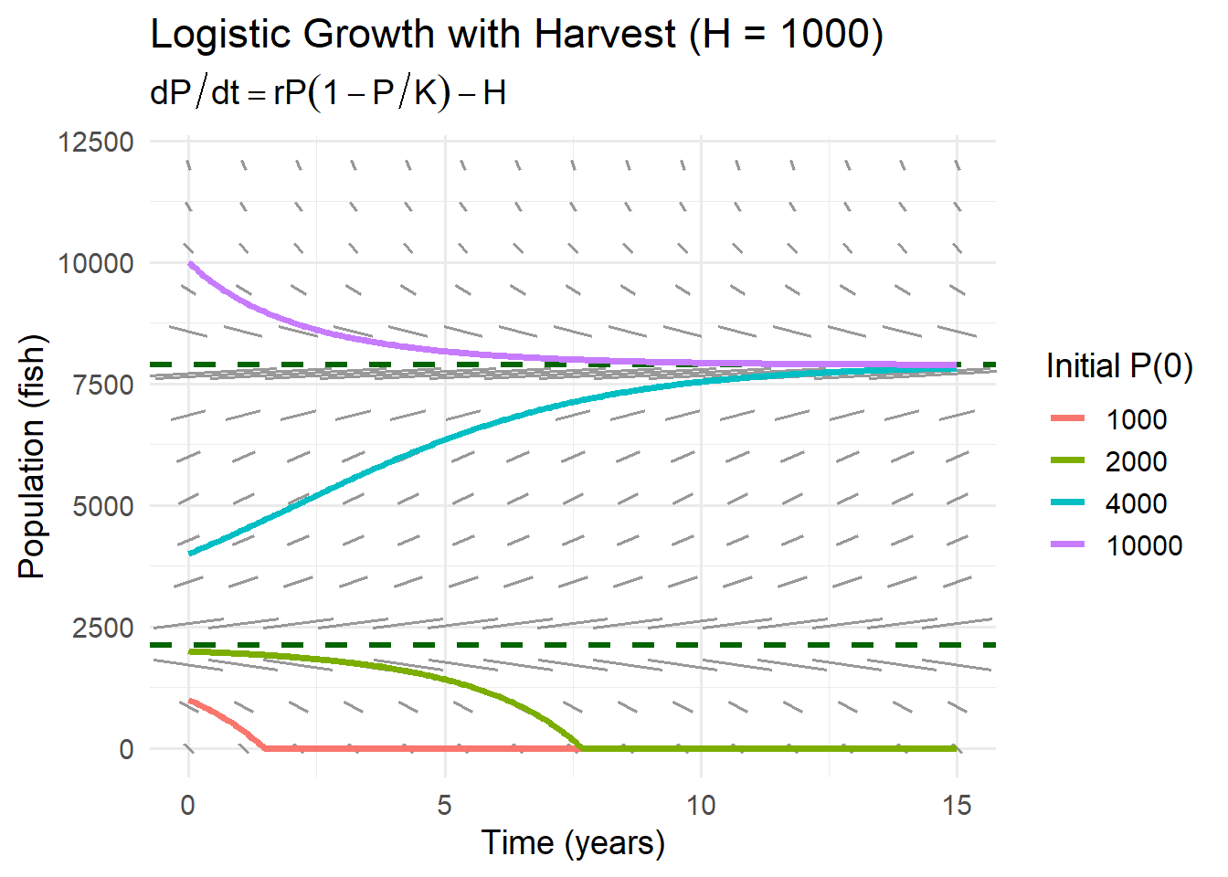 Overharvest: \(H>1500\). No equilibria. \(dP/dt<0\) for all \(P\).