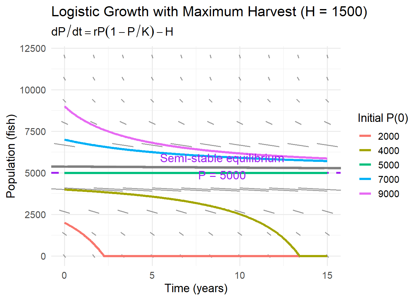 This is the tipping case \(H=H_{\max}\). The equilibrium is at \(P=K/2=5000\) and is semi-stable.