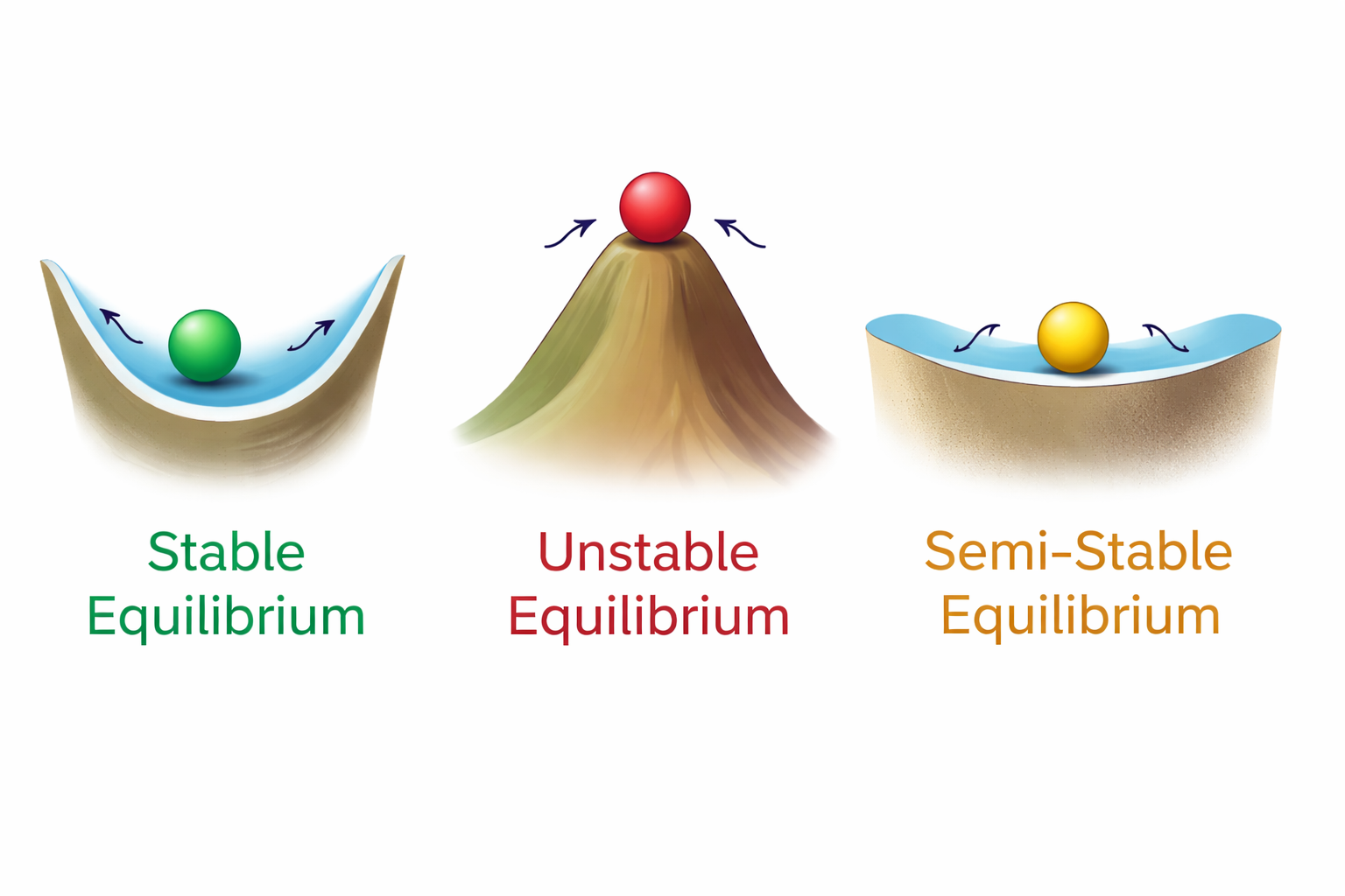 A stable equilibrium is like a ball at the bottom of a bowl: if you nudge it, it returns. An unstable equilibrium is like a ball on top of a hill: a small nudge makes it roll away. A semi-stable equilibrium behaves differently on each side, like a ridge where one direction returns and the other direction falls away. In the fish harvest model, the stable equilibrium corresponds to a population level the system returns to after small disturbances, while the unstable equilibrium acts like a threshold: if the population drops below it, the system moves away toward collapse.