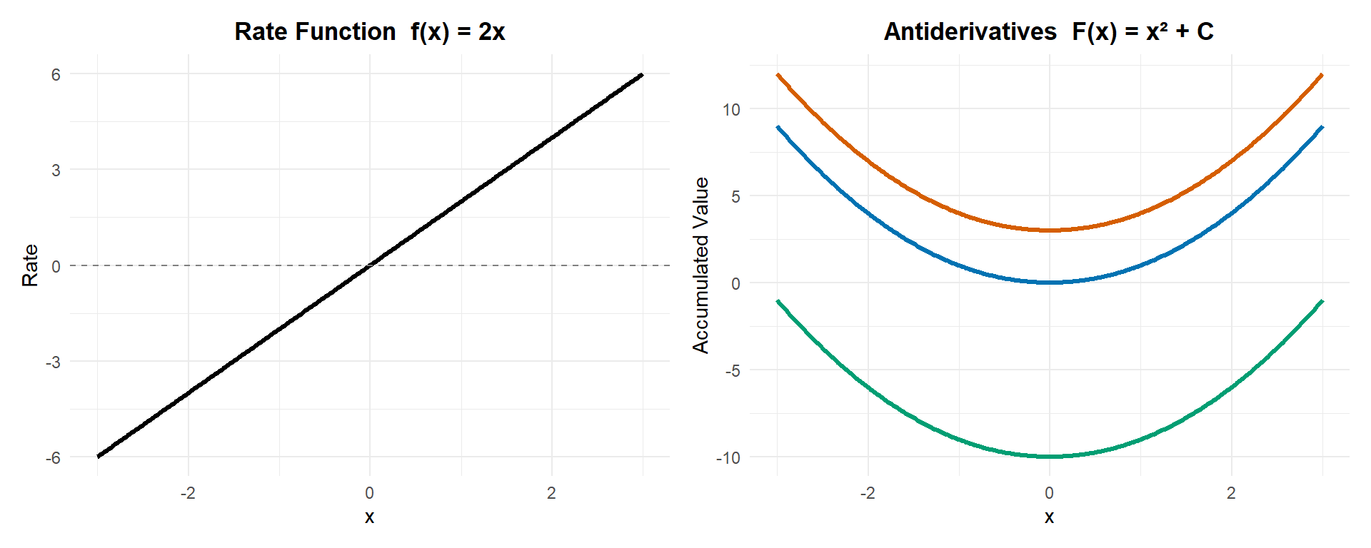 Any of the following functions has derivative \(2x\): \[ x^2,\quad x^2 + 3,\quad x^2 - 10,\quad x^2 + C. \]