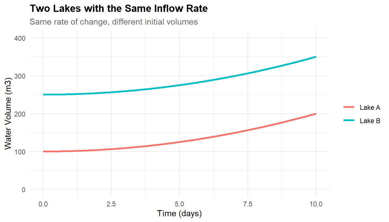 Suppose two lakes experience the same inflow rate of water, modeled by \[ f(t) = 2t \quad \text{(m³/day)}, \] where \(t\) is time in days.