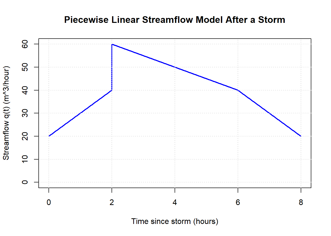 After a heavy rain event, the streamflow in a small watershed changes over the course of the day. Hydrologists model the streamflow rate \(q(t)\) (in cubic meters per hour) as a piecewise linear function of time \(t\) (in hours since the storm began).