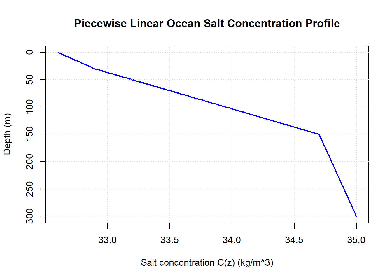 Let \(C(z)\) be the salt concentration (in kg/m\(^3\)) as a function of depth \(z\) (in meters), measured downward from the ocean surface. Suppose the concentration profile is modeled by the piecewise linear function: