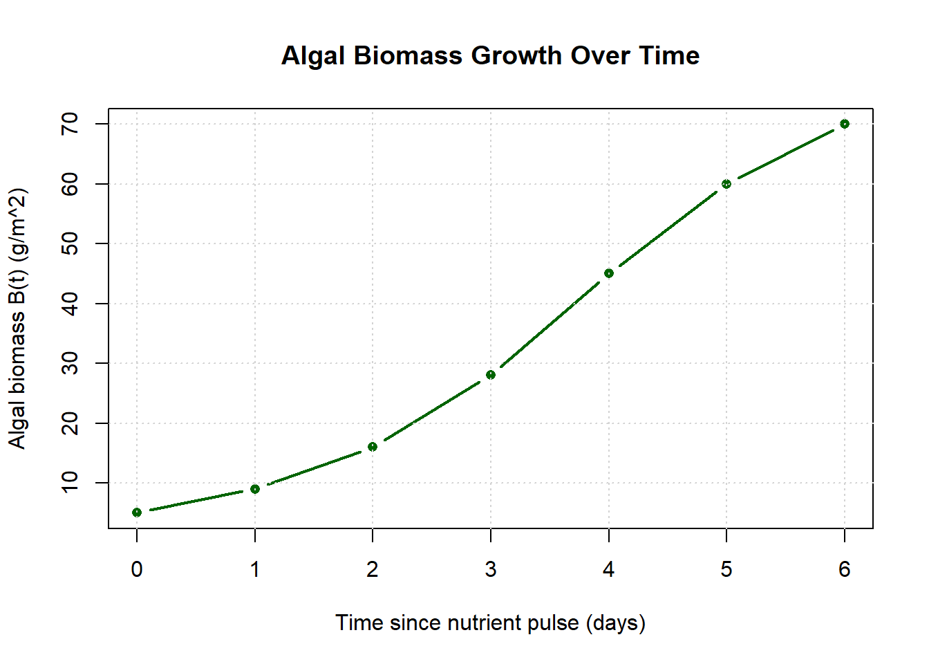 Let \(B(t)\) represent algal biomass density (in g/m\(^2\)) measured at time \(t\) (in days) after the nutrient input.