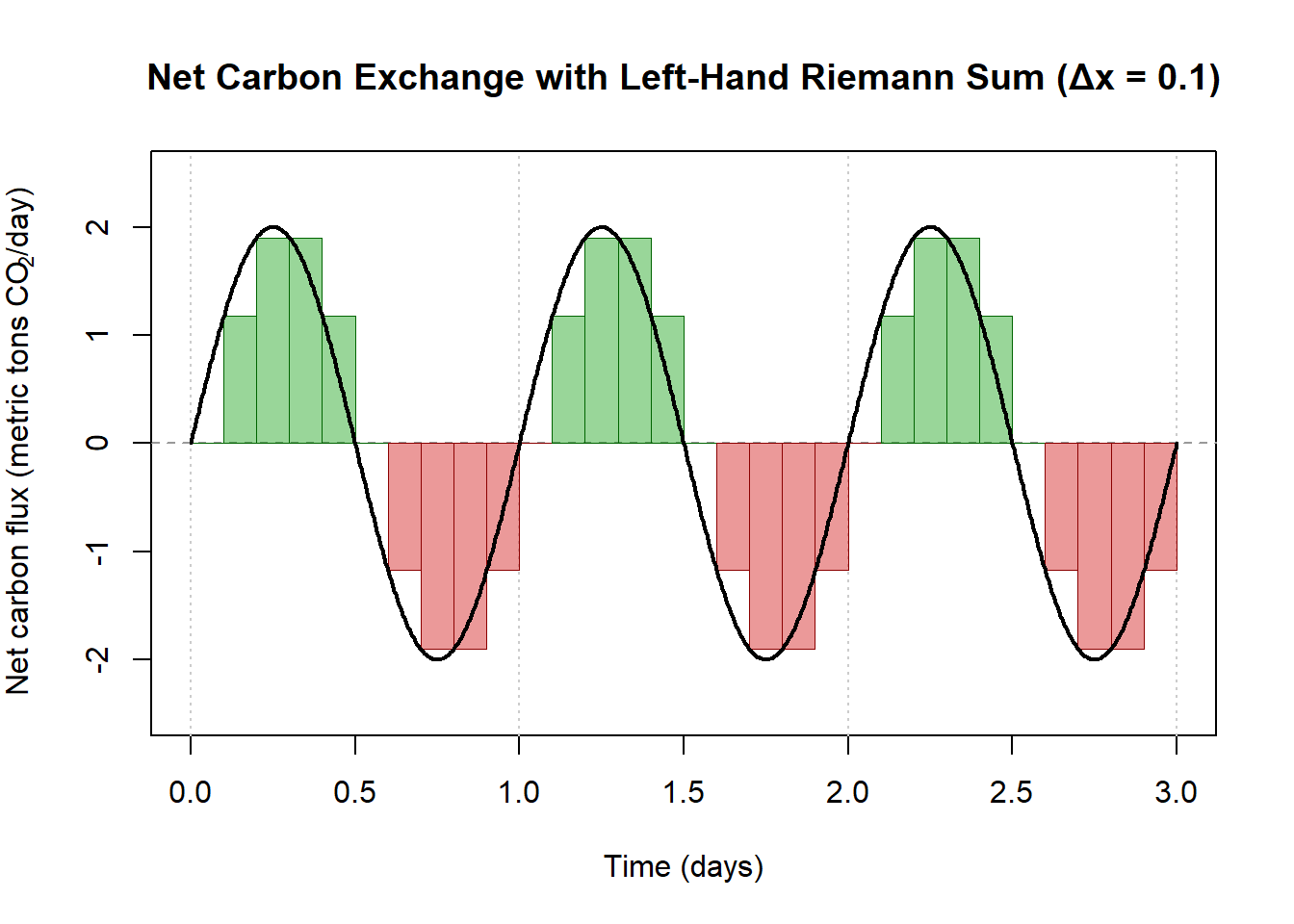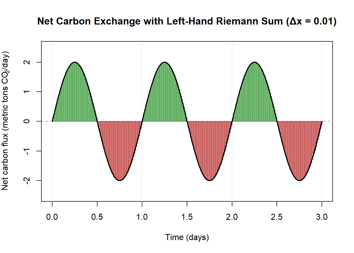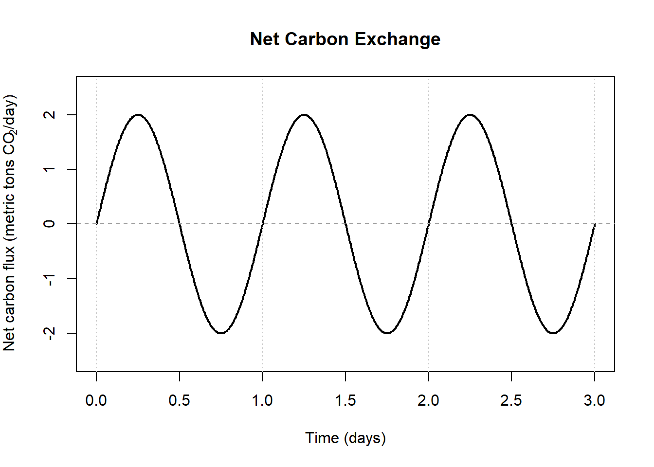 Suppose the net carbon flux (in metric tons of CO\(_2\) per day) is modeled by: \[ f(t) = 2\sin\!\left(2\pi t\right) \quad \text{on } [0,3], \] where \(t\) is time in days.