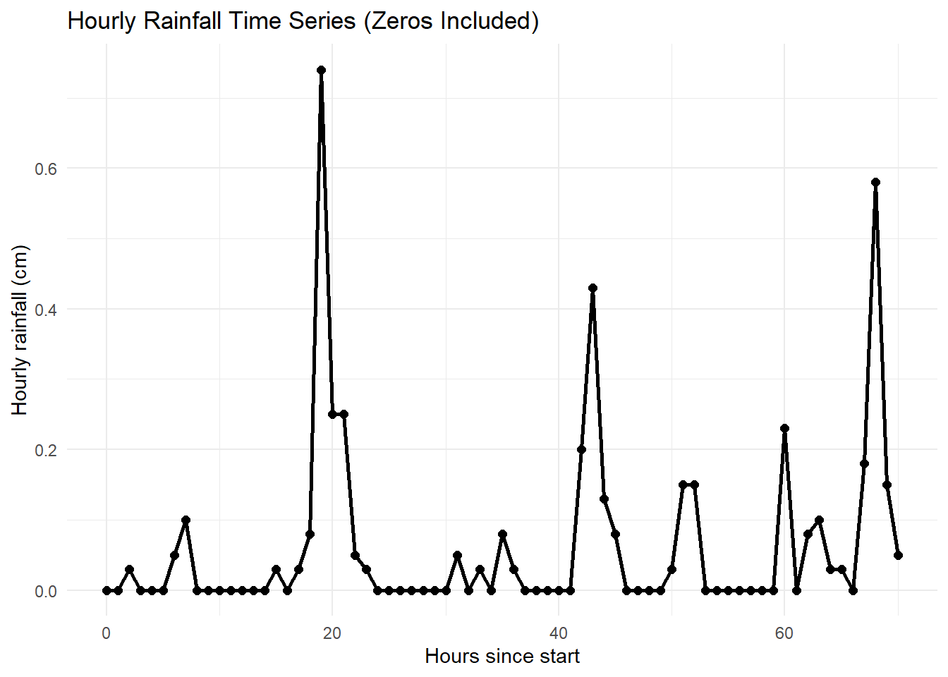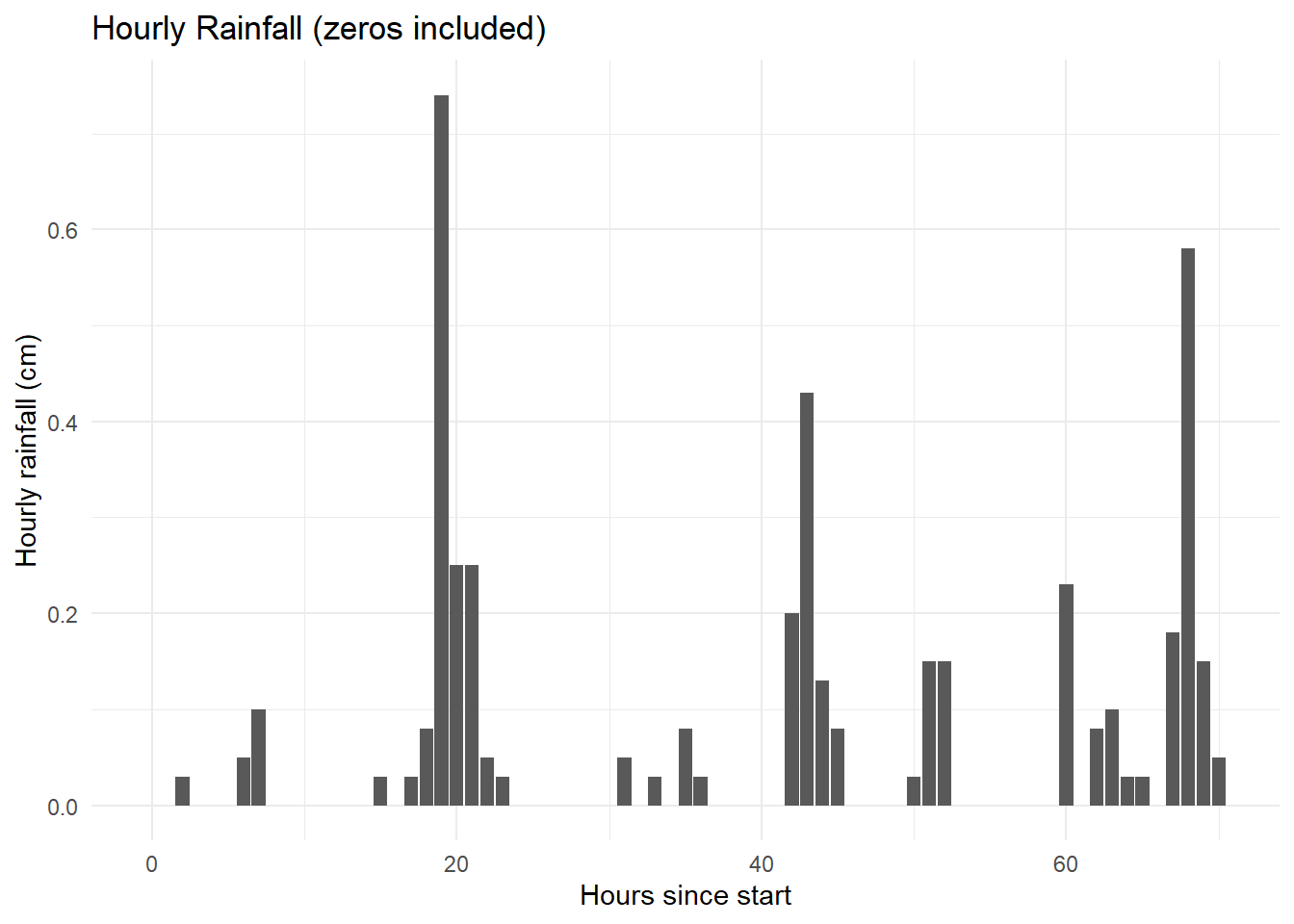 Look at the graphs of rainfall intensity that varies continuously over time.