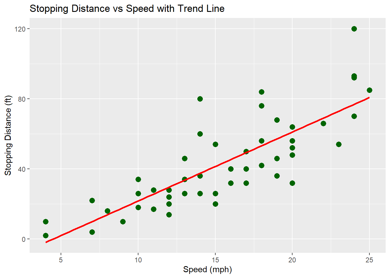 You can add extra layers to your plots. For instance, let’s fit a simple linear model and add the regression line to the cars plot.
