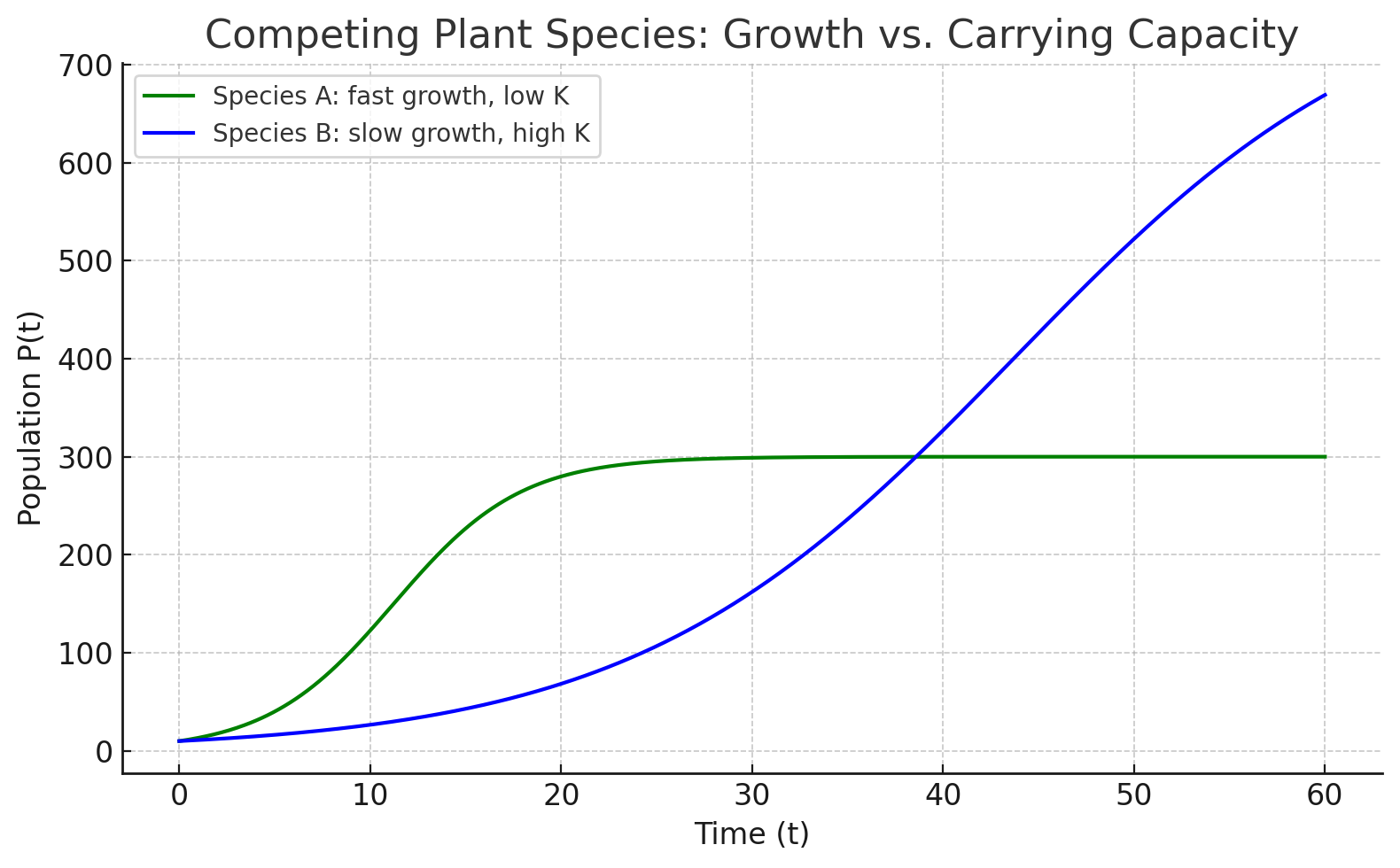 - Example: Competing plants. Two plant species colonize a disturbed site. Species A has a higher growth rate (\(r\)) but a lower carrying capacity (\(K\)) due to limited resource efficiency. Species B has a slower growth rate but a higher carrying capacity. Which species dominates depends on the timescale of interest: in the short term, Species A may dominate, but in the long term, Species B may outlast it.