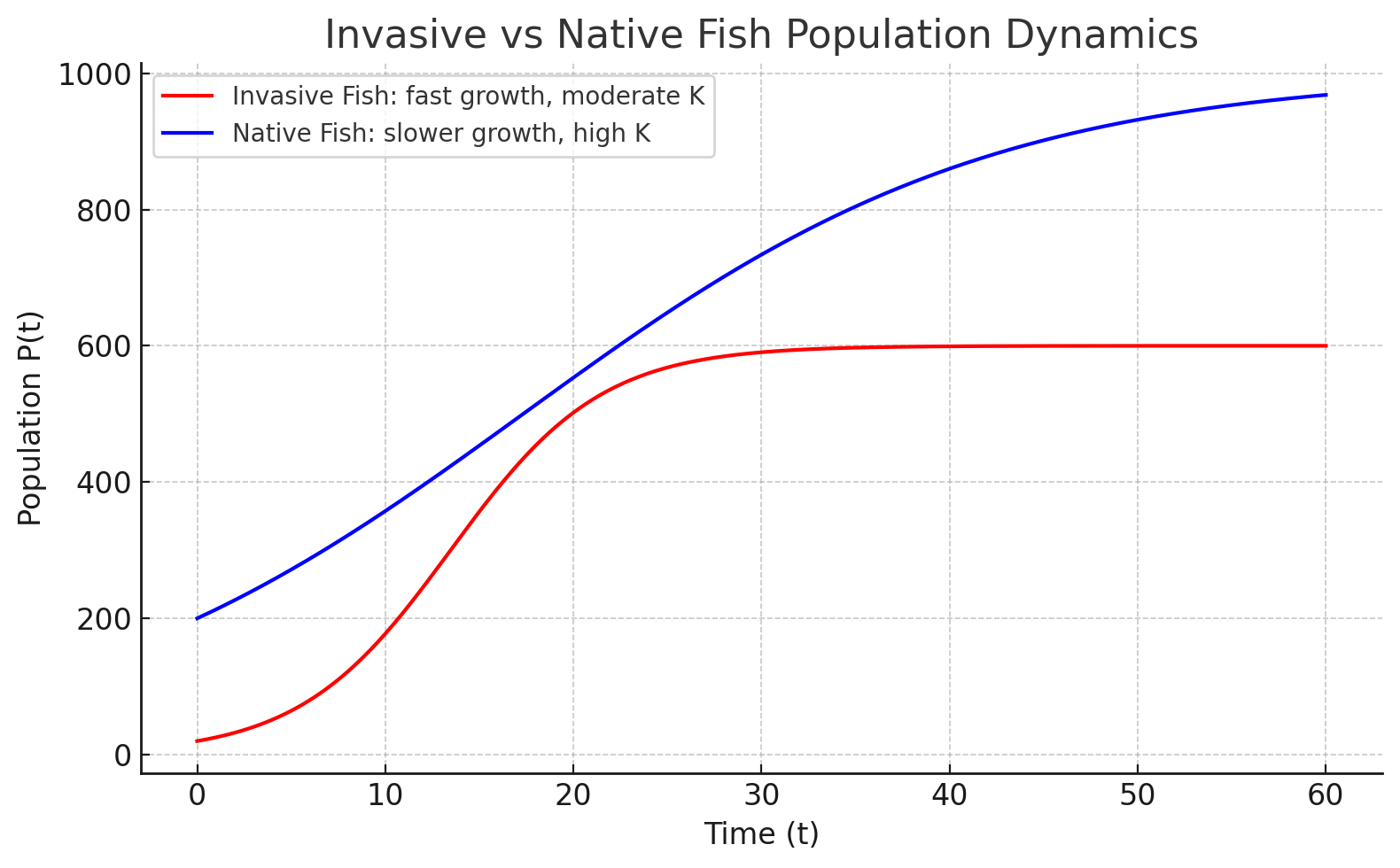 - Example: Invasive vs native fish. An invasive fish species may have a larger \(r\), allowing it to spread quickly, while a native species may be closer to carrying capacity. Understanding both parameters can guide whether intervention is urgent.