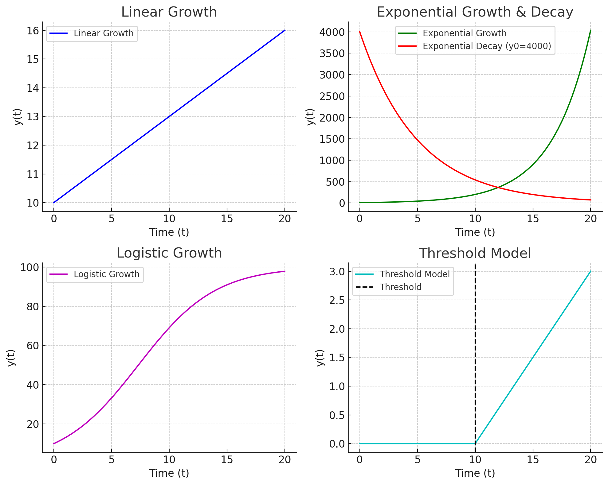 - Compare growth forms (linear, exponential, logistic, decay, thresholds) and match them to ecological stories.