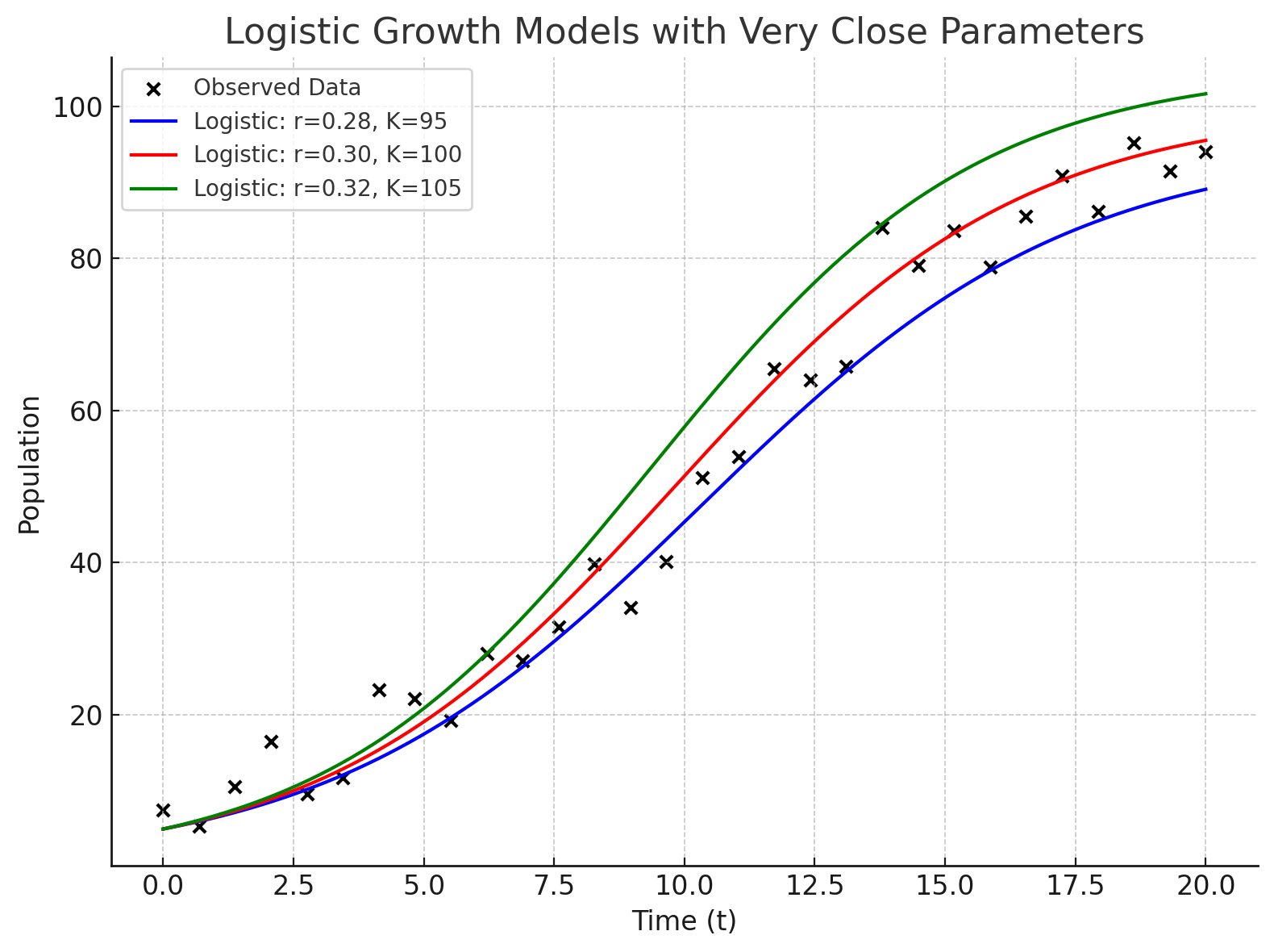 - Population dynamics are sensitive to small changes in parameters. For example, a slightly higher \(r\) may cause a species to reach \(K\) much faster, while changes in \(K\) shift the long-term ceiling.