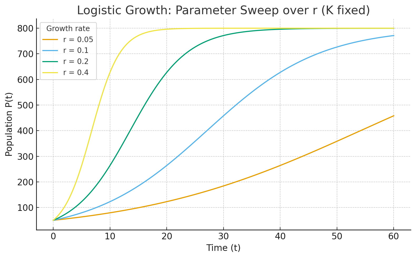 - Plotting logistic growth curves for several values of \(r\) shows how faster growth accelerates the time to reach carrying capacity.