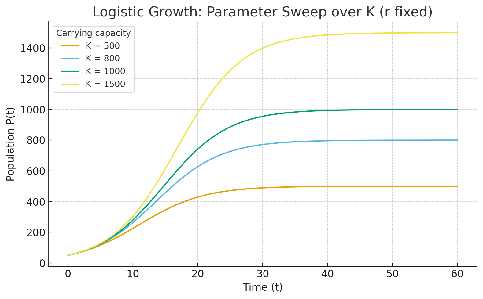 - Plotting curves for different \(K\) values illustrates how the ceiling of growth changes.