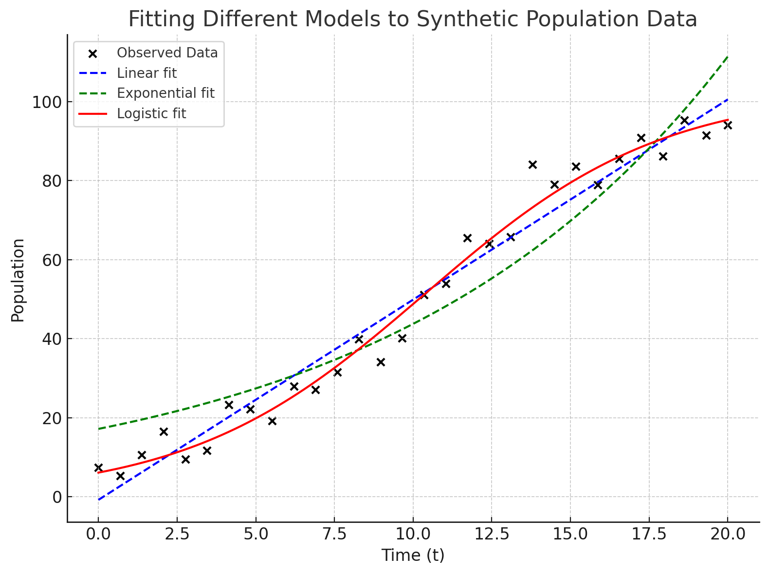 - Fit models to data and interpret parameters (e.g., growth rate \(r\), carrying capacity \(K\)) with attention to error and uncertainty.